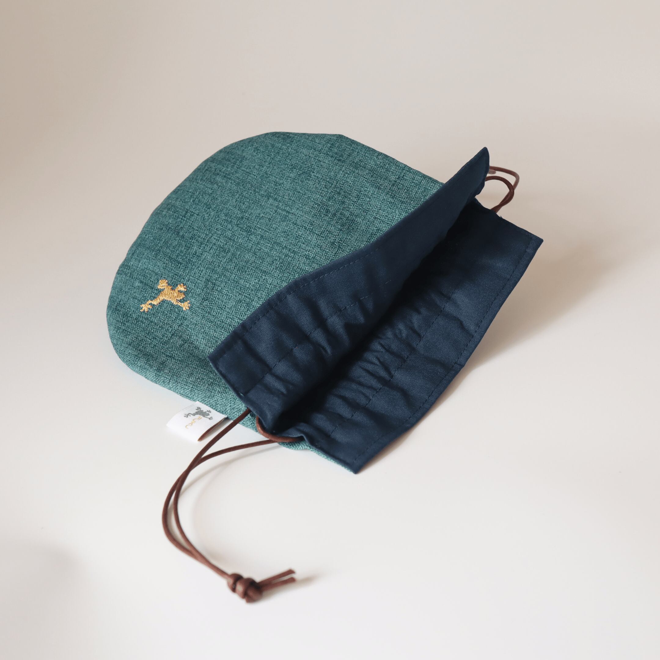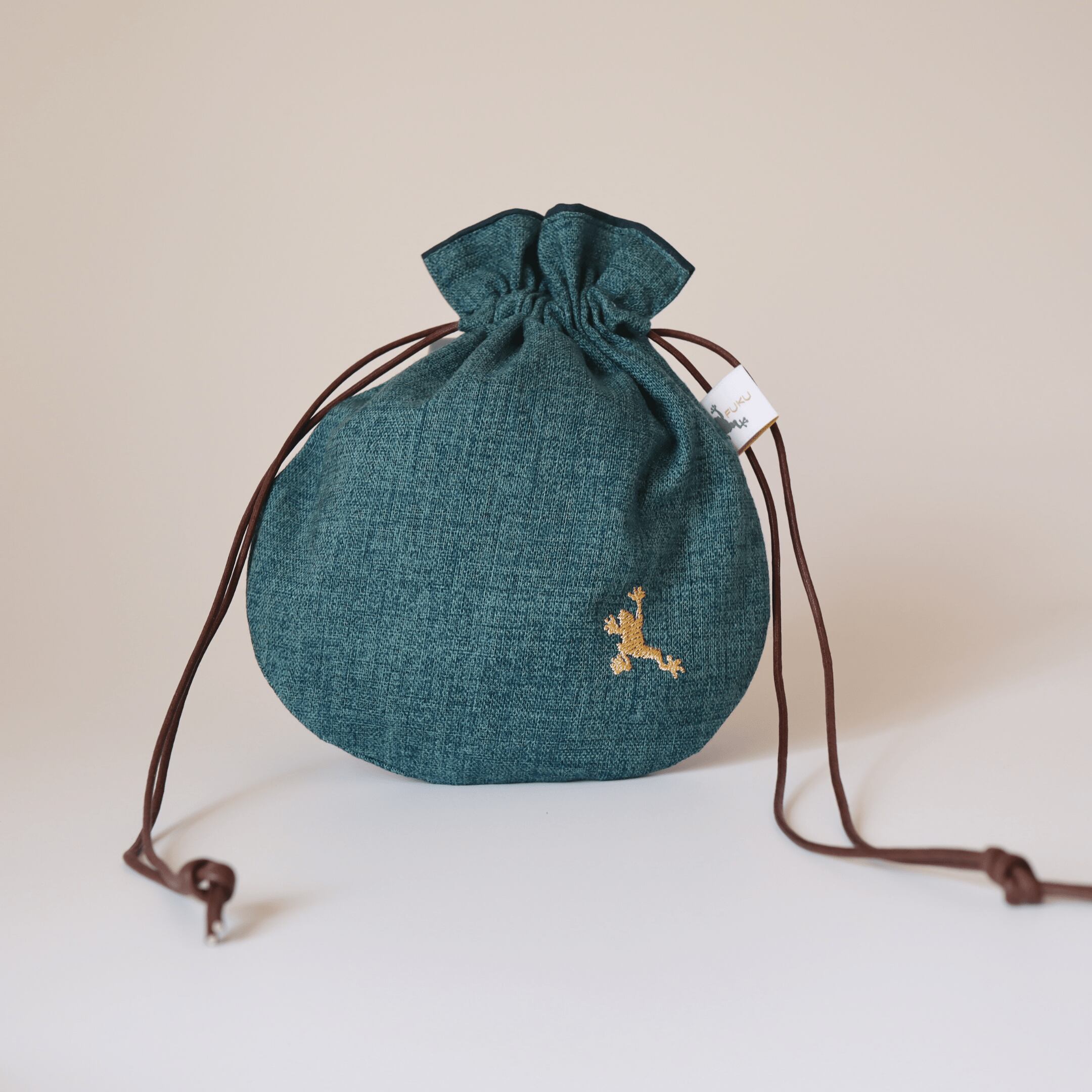 福かえる袋 | グリーン&ネイビー 巾着 ラッキーかえる 一点もの お金の袋 縁起のいいかえる刺繍