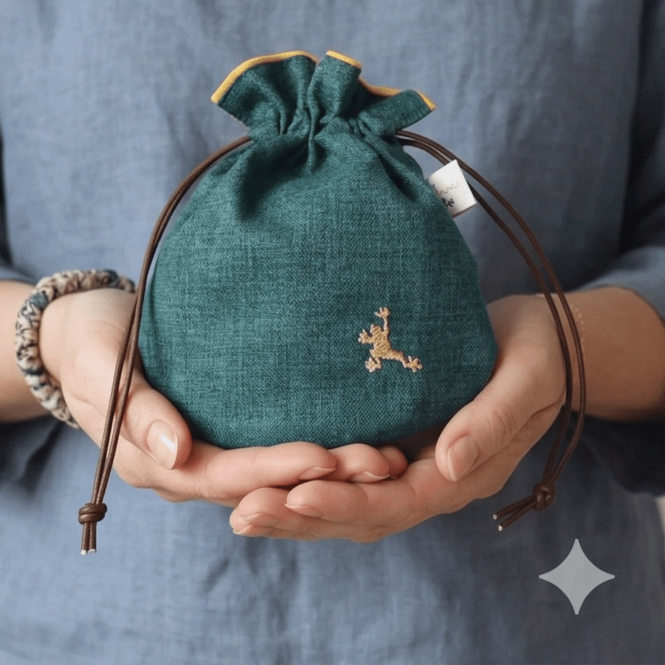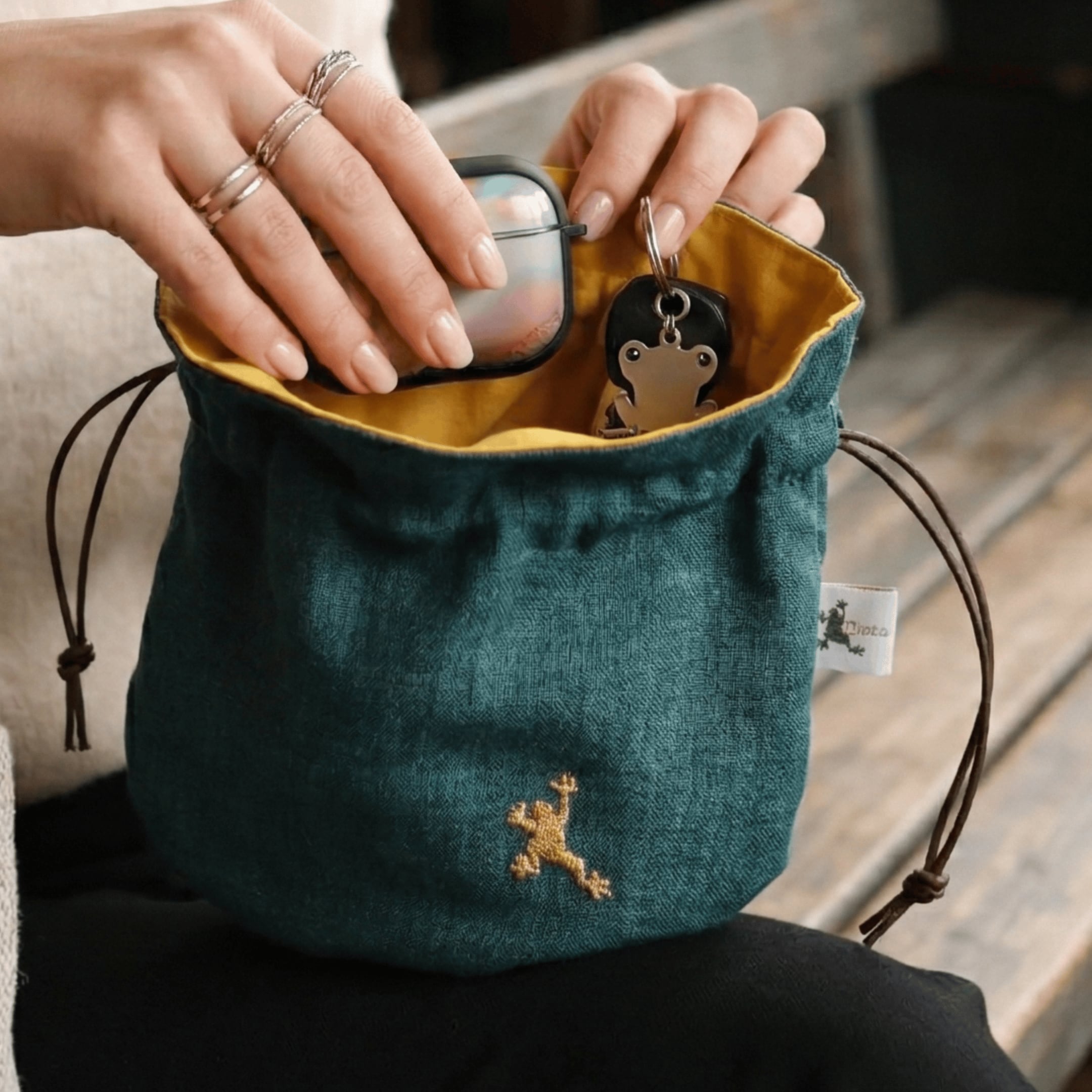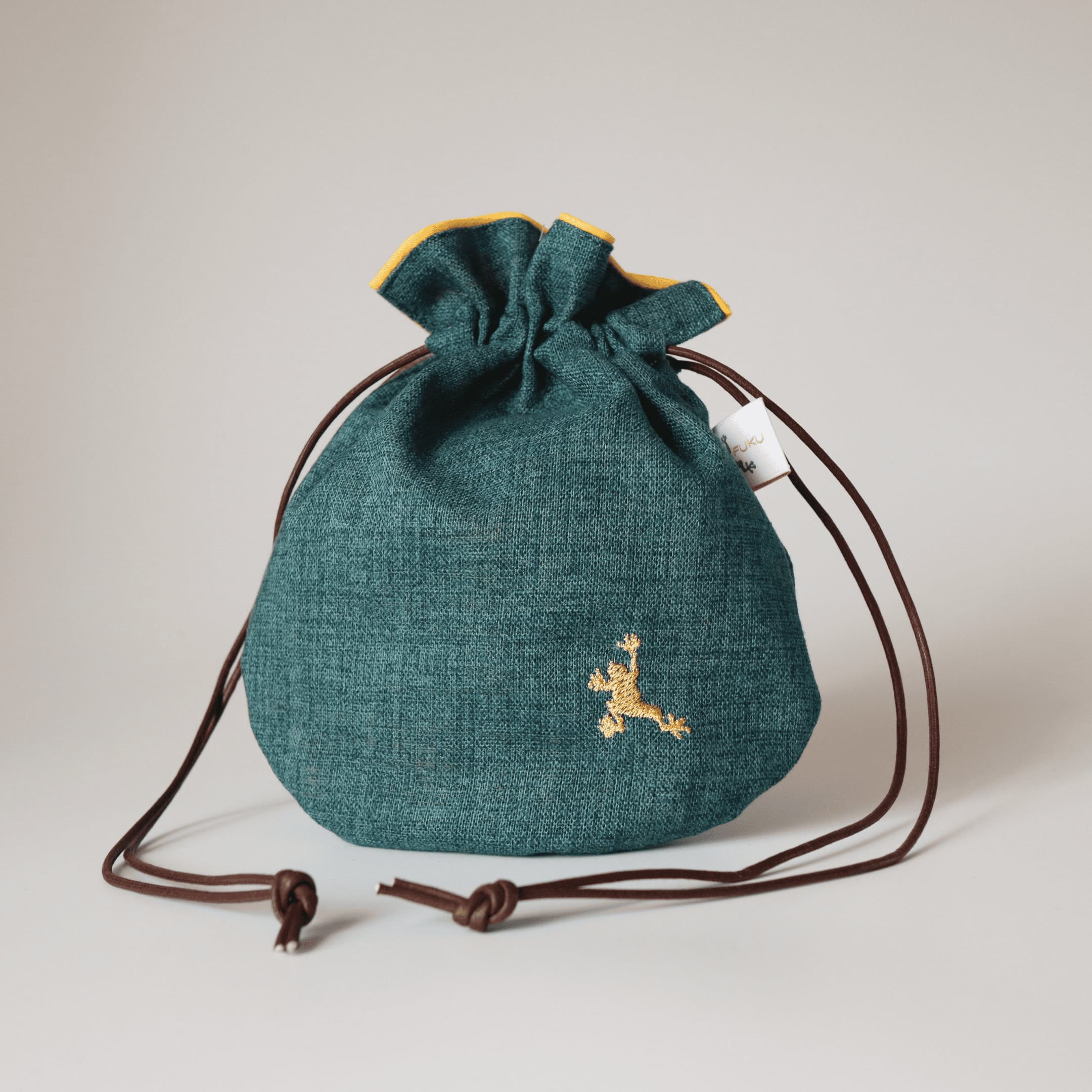 静かに寄り添う“福かえる”の巾着袋。銭袋。