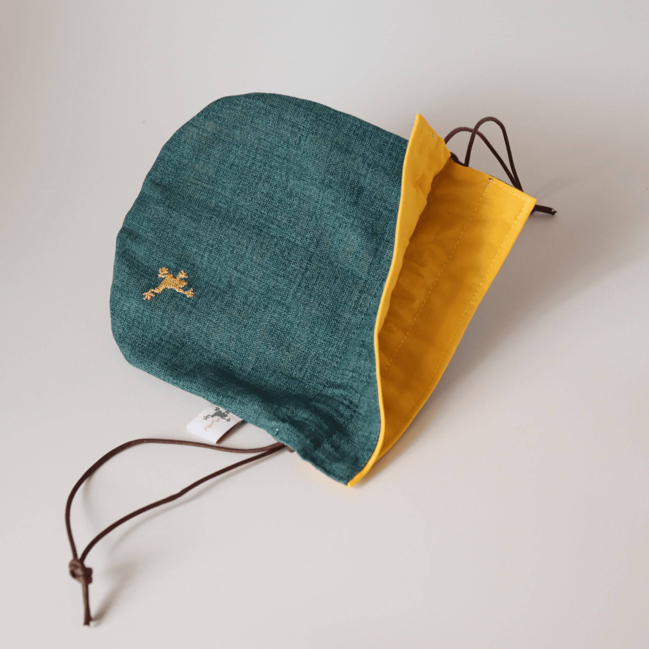 福かえる袋 | グリーン&イエロー 巾着 ラッキーかえる 一点もの お金の袋 縁起のいいかえる刺繍