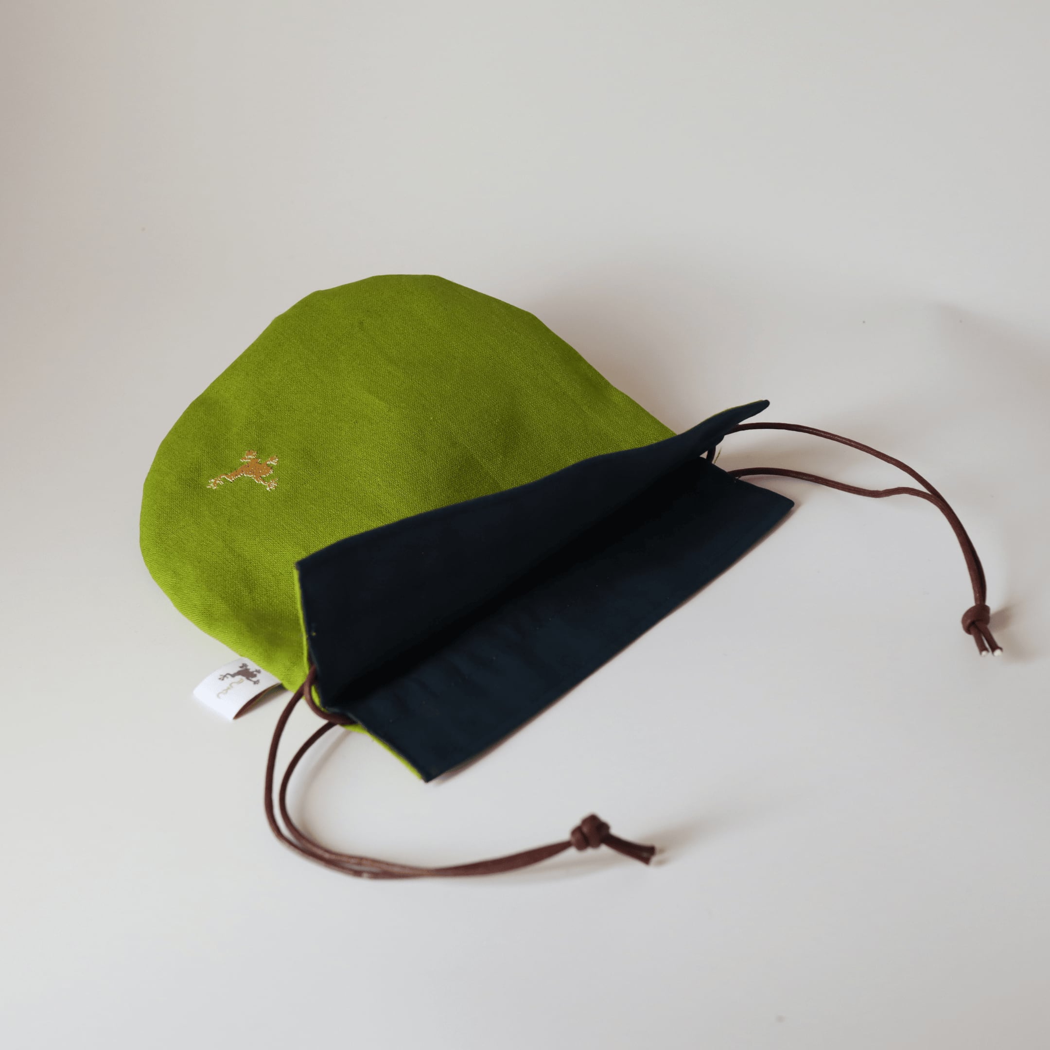 福かえる袋 | ライトグリーン&ネイビー 巾着 ラッキーかえる 一点もの お金の袋 縁起のいいかえる刺繍